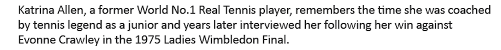 Our paths crossed a number of times after that. Every time she saw me she’d say ‘how are ya doing? how’s ya game?’ in her American drawl. I began to think I had a double. Surely she didn’t really recognise me. But it was great kudos – my schoolmates would say ‘does she know you?’ ‘Oh yes, we go back a long way, Billie Jean and I’.